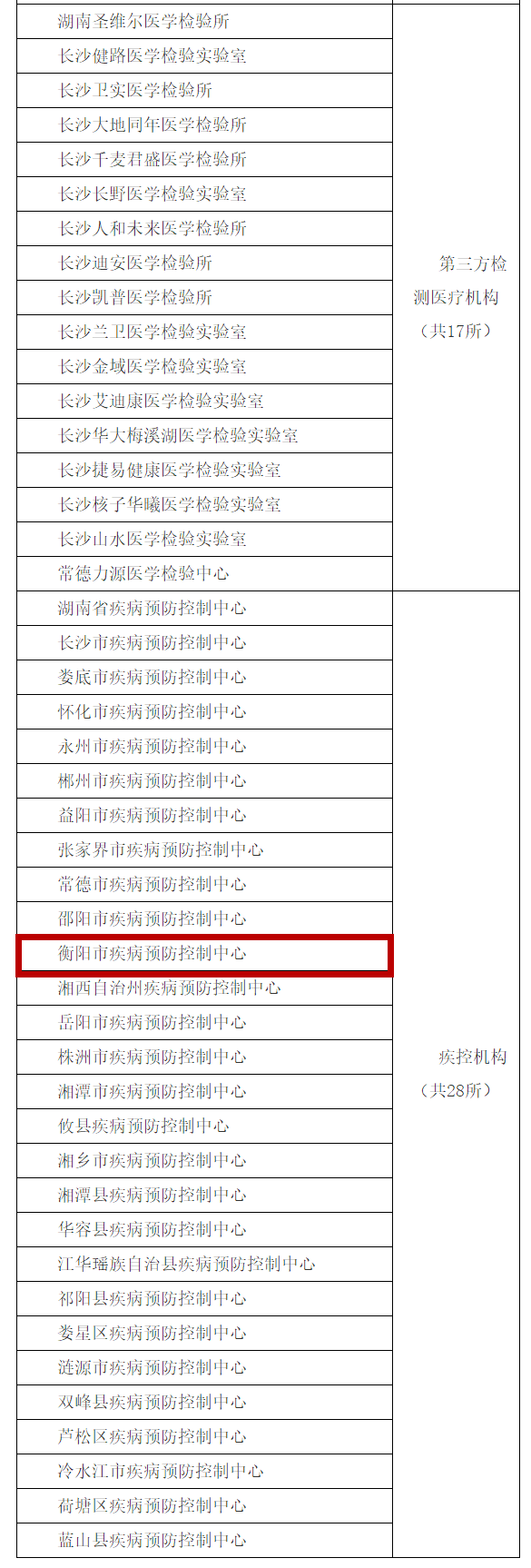 經(jīng)國家衛(wèi)生健康委臨床檢驗中心《新冠病毒核酸檢測信息平臺》查詢,湖南開展新冠病毒核酸檢測的醫(yī)療機構(gòu)名單5月19日下午公布。其中,衡陽有9家醫(yī)療單位可開展新冠病毒核酸檢測,他們分別是南華大學附屬第一醫(yī)院、南華大學附屬第二醫(yī)院、南華大學附屬南華醫(yī)院、衡陽市中心醫(yī)院、衡陽市第一人民醫(yī)院、衡陽市第三人民醫(yī)院、衡東縣人民醫(yī)院、常寧市人民醫(yī)院、衡陽市疾病預防控制中心。具體名單如下: