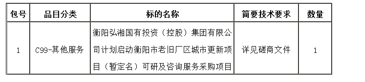 采購項(xiàng)目名稱:衡陽弘湘國有投資(控股)集團(tuán)有限公司計(jì)劃啟動(dòng)衡陽市老舊廠區(qū)城市更新項(xiàng)目(暫定名)可研及咨詢服務(wù)采購項(xiàng)目