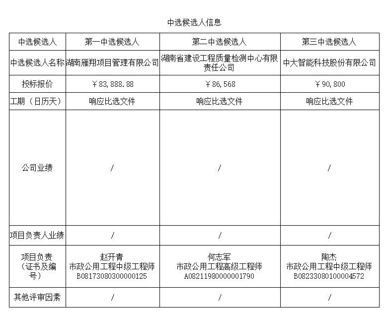 植物園片區(qū)雁云路(幸福河街-紅峰路段)項(xiàng)目檢測(cè)單位咨詢服務(wù)比選于2025年08月21日15時(shí)00分在衡陽國(guó)投4棟3樓評(píng)標(biāo)室進(jìn)行了比選開標(biāo)、評(píng)標(biāo)活動(dòng),評(píng)標(biāo)委員會(huì)按照比選文件及相關(guān)法律法規(guī)規(guī)定進(jìn)行評(píng)審,推薦以下三名中選候選人(排序),現(xiàn)將相關(guān)信息予以公示。