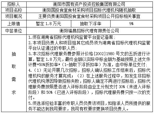 衡陽國投食堂食材采購項(xiàng)目招標(biāo)代理機(jī)構(gòu)隨機(jī)抽取結(jié)果公示